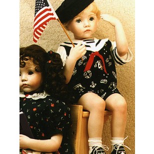 Handmade Sailor Romper is made of a navy nautical print with white sleeves and collar trimmed with navy ribbon and red ribbon tie. Back zipper closure. Fits 24" dolls and 21" bears. Hat, shoes & socks and flag not included.